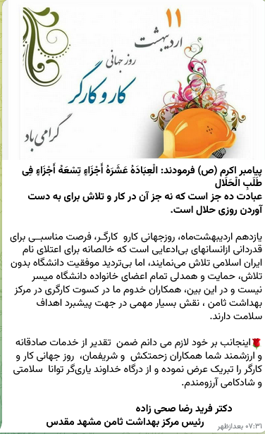 عزم، همت و عرق جبین کارگران، مصداق حقیقی عبادت و بندگی خداوند متعال و دستان کارگر، دستی از جانب خداوند برای رهانیدن انسان از آتش دوزخ است. بی شک بوسه پیامبر گرامی اسلام صلی الله علیه و آله نیز بر دستان کارگر، مهر تاییدی بر قداست، منزلت و کرامت کارگران شریف به شمار می رود.