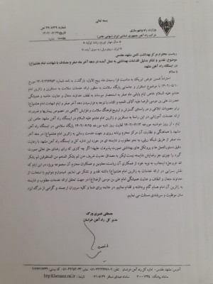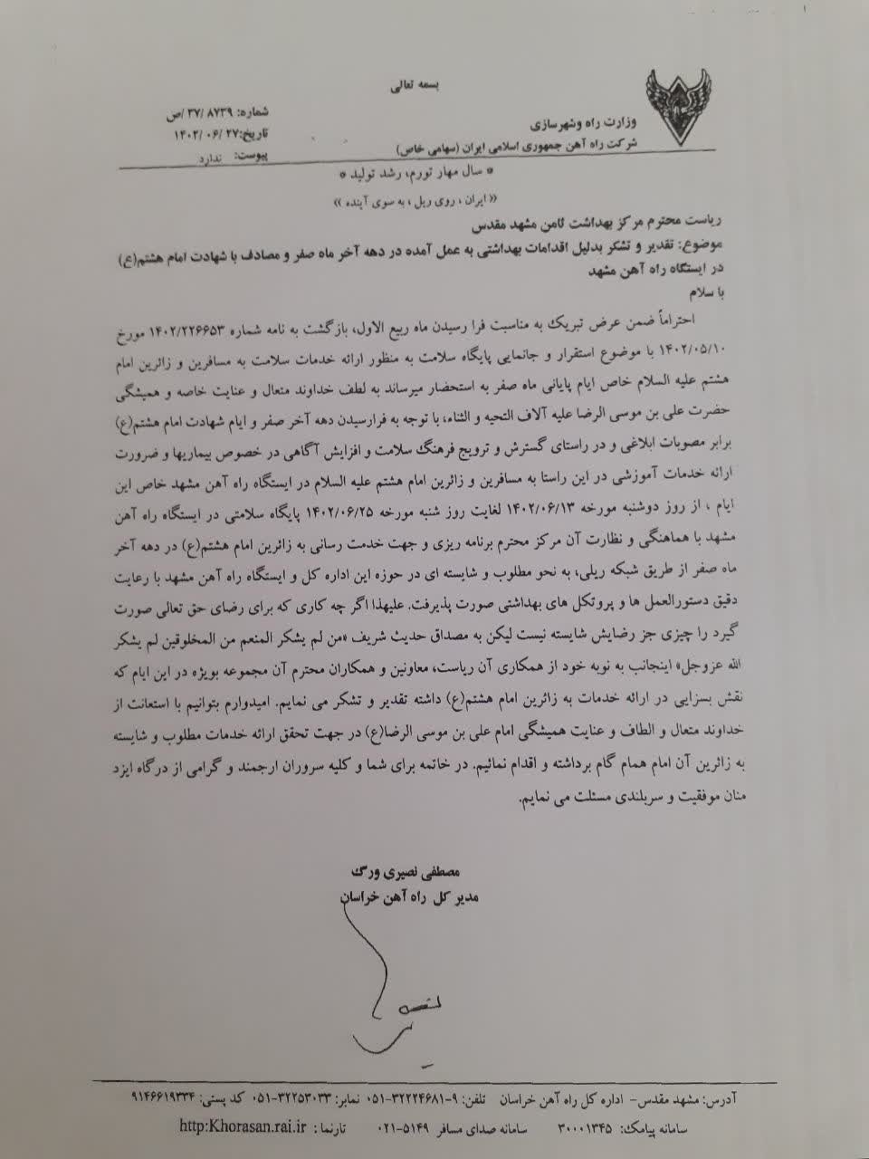 تقدیر وتشکر جناب آقای مهندس نصیری مدیرکل محترم راه اهن خراسان از ریاست محترم مرکز بهداشت ثامن و همکاران گرامی در راستای اقدامات بهداشتی بعمل آمده در دهه پایانی ماه صفر در ایستگاه سلامت راه آهن