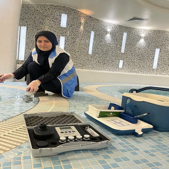 کنترل کیفی میکروبی و شیمیایی آب استخرهای شنا در واحدهای اقامتی حریم مطهر رضوی بازدید کارشناس سلامت محیط مرکز بهداشت ثامن جهت نظارت بر وضعیت بهسازی و رعایت پروتکل های بهداشتی و انجام نمونه برداری، کلرسنجی؛ کدورت سنجی و سنجش Ph آب از استخرهای اقامتی در راستای تامین سلامت زائرین و مجاورین بارگاه منور رضوی
