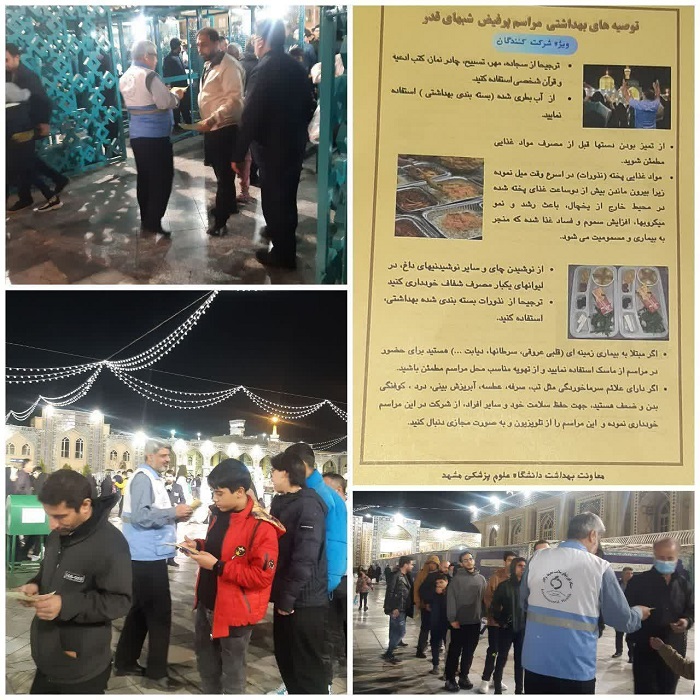 توزیع پمفلت های آموزشی( توصیه های بهداشتی در مراسم پرفیض شبهای قدر) به زائرین ومجاورین حضرت علی بن موسی الرضا علیه السلام در حرم مطهر رضوی توسط کارشناسان سلامت محیط مرکز بهداشت ثامن