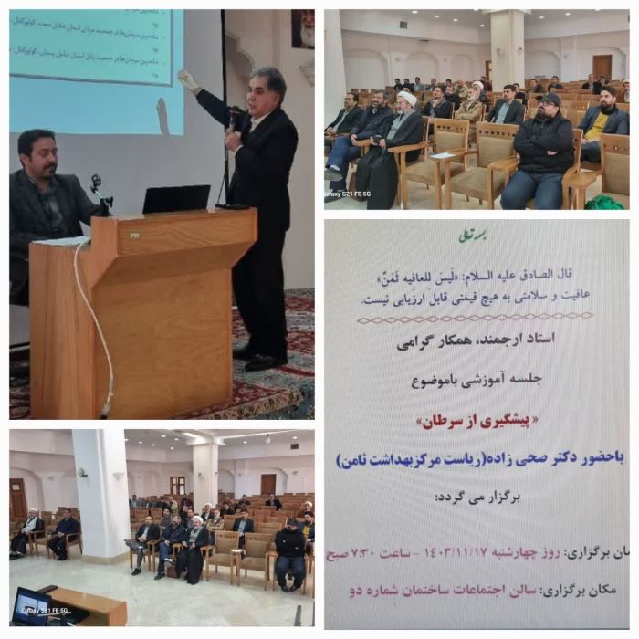 برگزاری جلسه آموزشی در راستای پیشگیری از سرطان های شایع جهت پرسنل دانشگاه جامع علوم رضوی با حضور ریاست محترم مرکز بهداشت ثامن جناب آقای دکتر صحی زاده و کارشناس محترم واحد مدیریت بیماریها جناب آقای قرین مورخه 17 بهمن 1403 (روابط عمومی مرکز بهداشت ثامن )