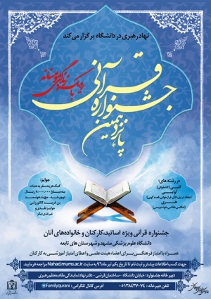نصرتی در گفتگو با روابط عمومی نهاد نمایندگی دانشگاه علوم پزشکی مشهد، ضمن اعلام این مطلب افزود: در پانزدهمین جشنواره قرآنی دانشگاه علوم پزشکی مشهد که ویژه اساتید، کارکنان دانشگاه علوم پزشکی مشهد و شهرستان های تابعه و خانواده های ایشان ( همسر و فرزندان ) برگزار می شود، برنامه ها و مسابقات ویژهی قرآنی در تمامی سطوح تحصیلی ( از پیش دبستان تا مقطع دکتری ) برگزار خواهد شد.