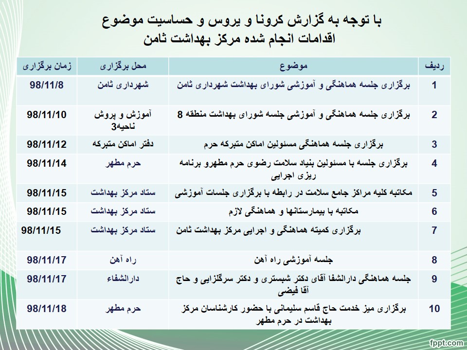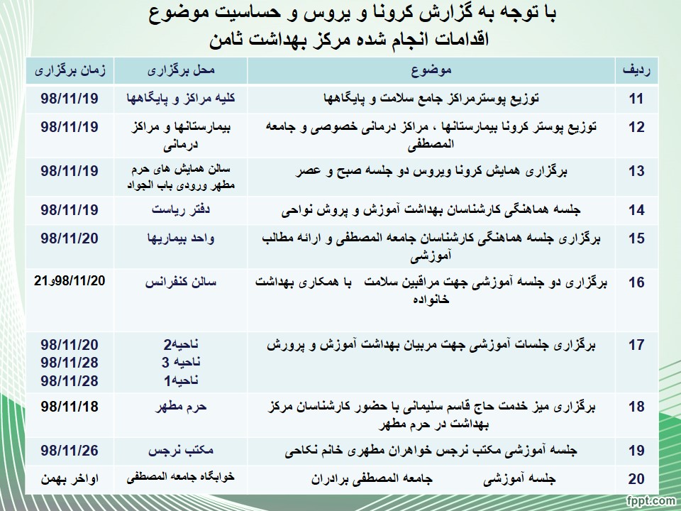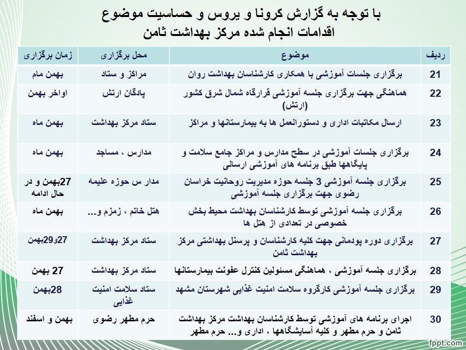 اخبار رضازاده سعیده اخبار 11 اسفند 1398 بازدید: 155 امتیاز: ( 0 Rating ) گزارش گوشه ای از فعالیتهای مرکز بهداشت ثامن در زمینه پیشگیری و مبارزه با کرونا ویروس امتیاز کاربران لطفا رای دهید رای 1 رای 2 رای 3 رای 4 رای 5 اقدامات انجام شده در زمینه پیشگیری و مبارزه با کرونا ویروس توسط مرکز بهداشت ثامن در بهمن ماه 1398 قبلی بعدی