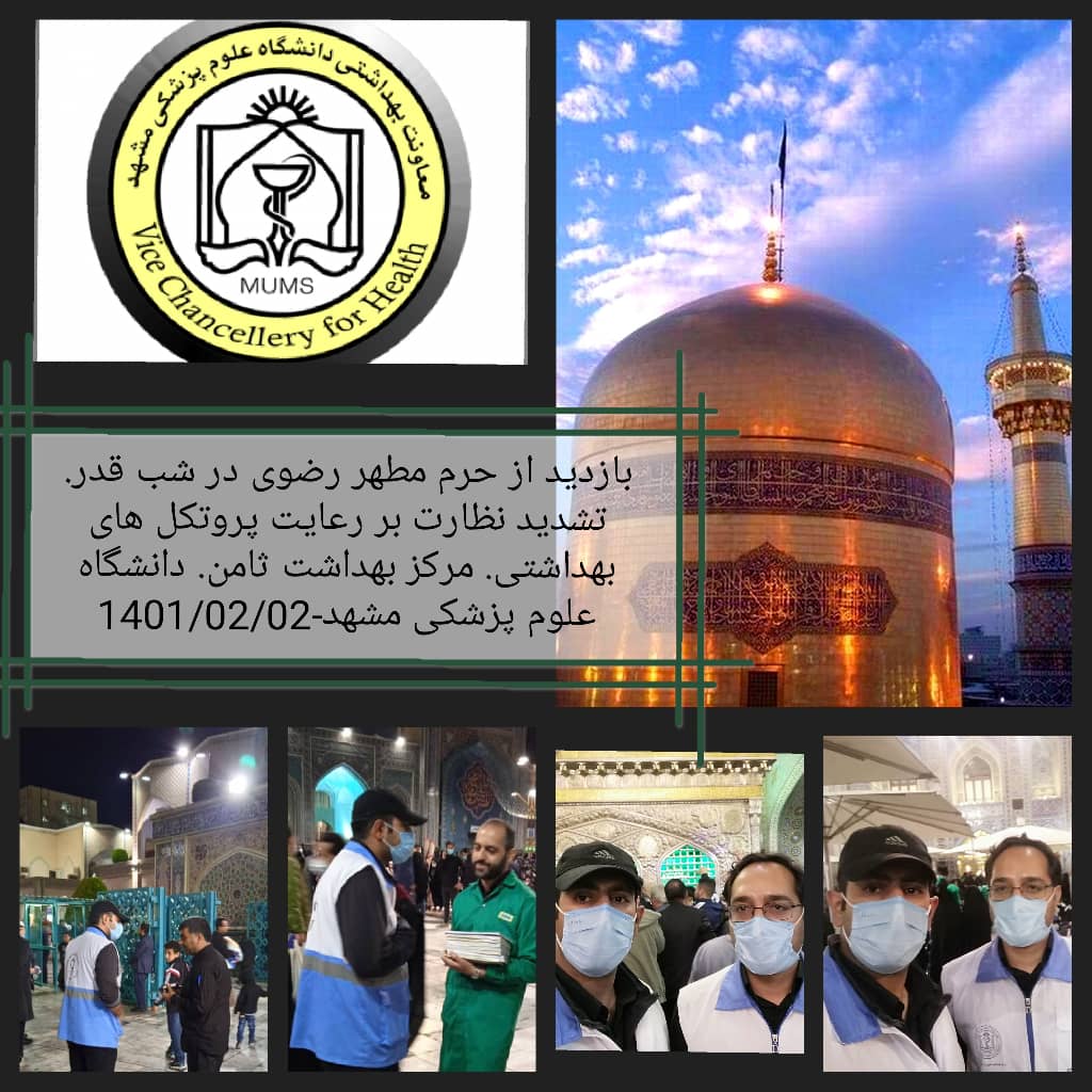 حضور کارشناسان سلامت محیط مرکز بهداشت ثامن در شبهای قدر 19- 21 و 23 در حرم مطهر رضوی جهت نظارت بر پروتکل ها و شیوه نامه بهداشتی و بازدید کارشناسان سلامت محیط و کار مرکز بهداشت ثامن از موکب ها و اتوبوس های منتهی به حرم رضوی